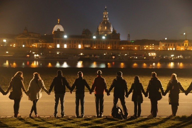في الثالث عشر من شباط في كل عام، كان يسير النازيون الجدد في المدينة للاحتفال بآثار الدمار، ولكن في السنوات الأخيرة تم منعهم من دخول المدينة من قبل سلسلة بشرية مكونة من أكثر من 10000 متظاهر يحملون رسالة إنسانية تلخص بالتالي: “لقد تسبب أسلافكم في تدمير هذه المدينة وسنحميها منكم، ولن تجرؤوا بعد الآن على الاعتداء والإساءة لهذا اليوم بالاحتفال بأهدافكم العنصرية.”