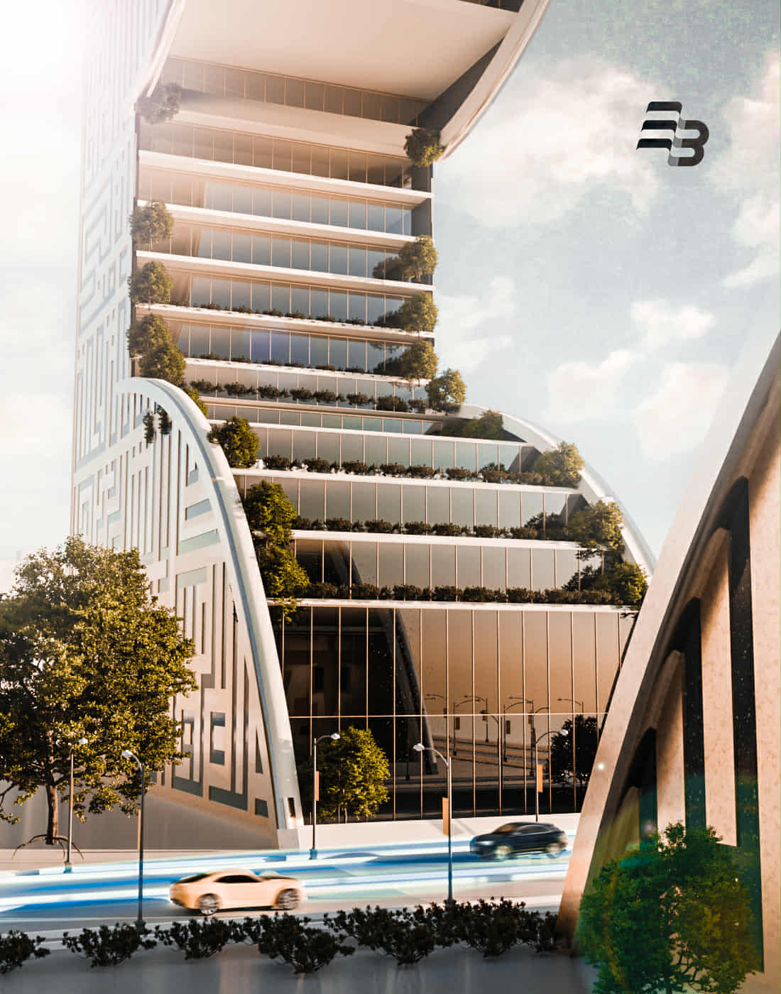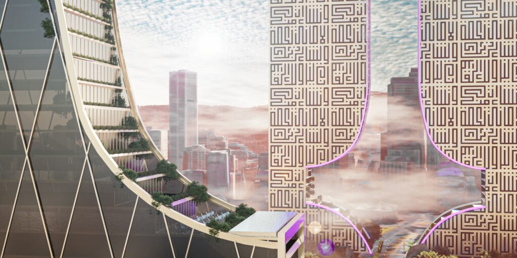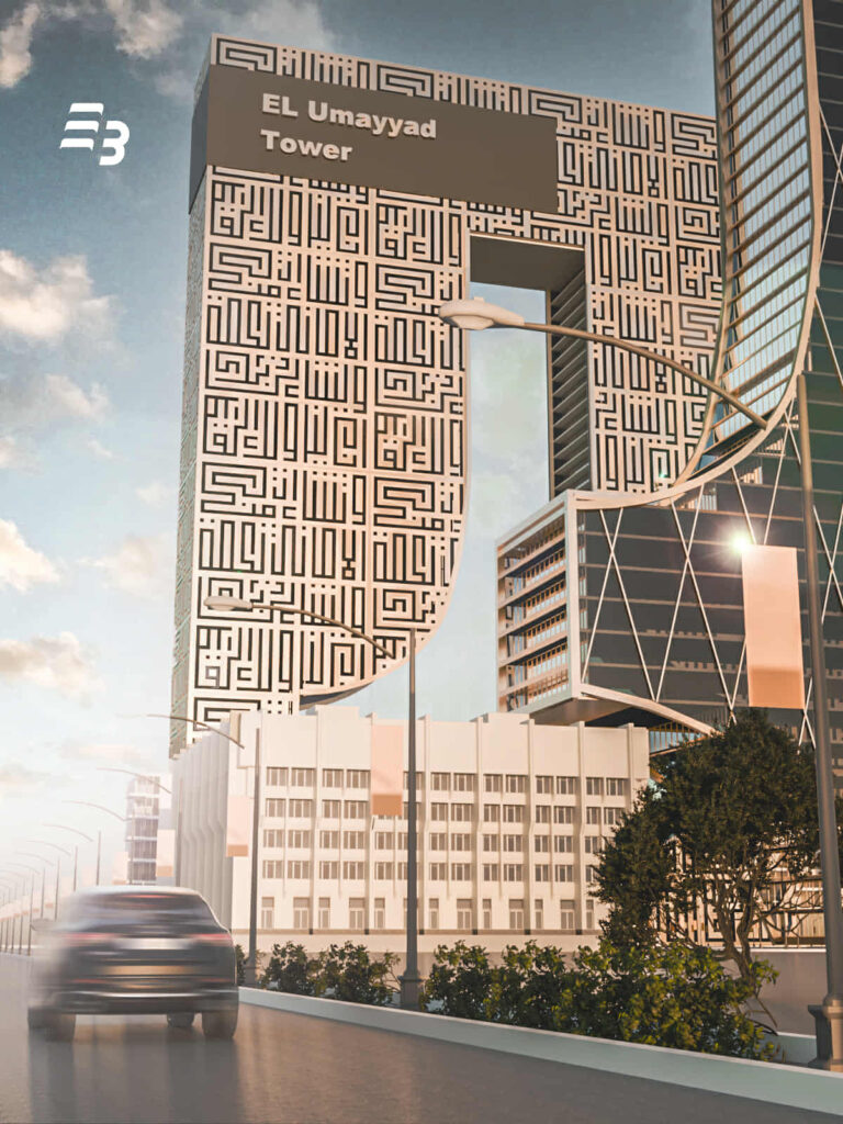 أما El-Umayyad Tower فكانت فكرته مستوحاة من رمزية الثبات والقوة. خلال الحرب، رأيت أن الأشكال الهندسية البسيطة كالمكعب والمثلث والهرم تعطي شعوراً بالاستقرار. لاحقاً تطورت الفكرة لتشمل رمزية السيف الأموي واللعب بالضوء والظل، واستلهمت من متحف المستقبل في دبي فكرة النقوش على الواجهات، لكني استخدمت الخط الكوفي لما يحمله من صلابة وجمال هندسي.