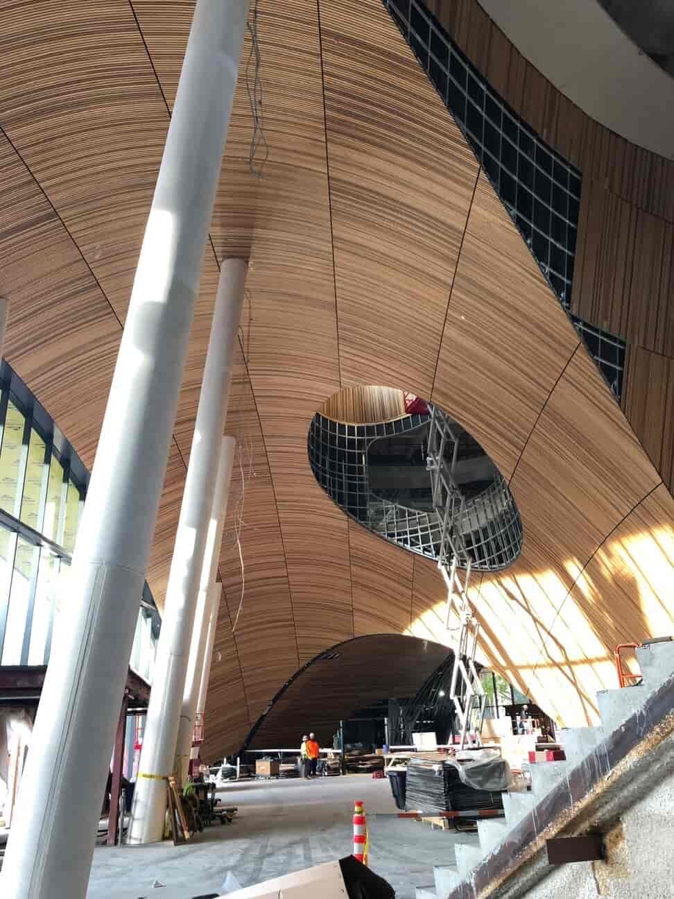 من الطابق الأرضي يوجد شق دائري محفور في سقف القبة الخشبية ، يسمىoculus .”يصل التصميم المجوف إلى الطابق العلوي من المبنى ، حيث يتم تغليفه بنافذة ضخمة.