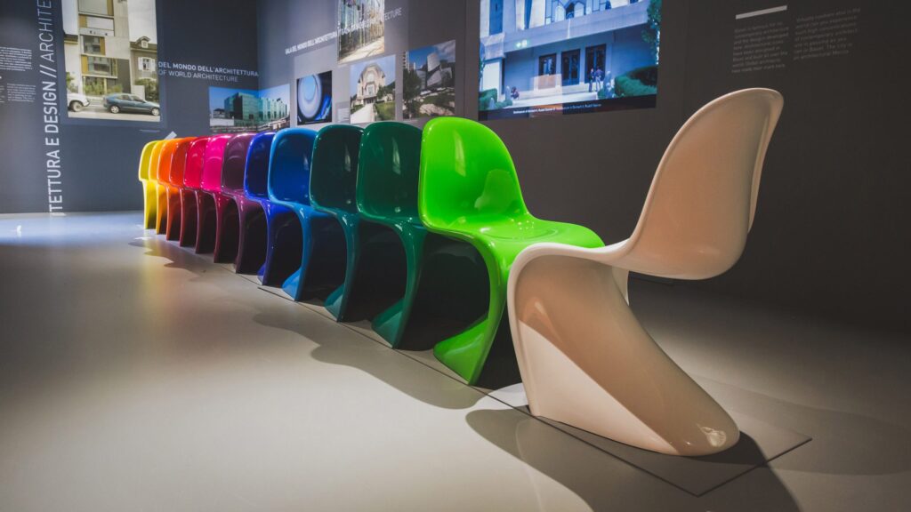 أول كرسي بلاستيكي في العالم يُصنع من قطعة واحدة دون أرجل، صممه فيرنر بانتون عام 1959 ليثور على قيود التصميم التقليدي.